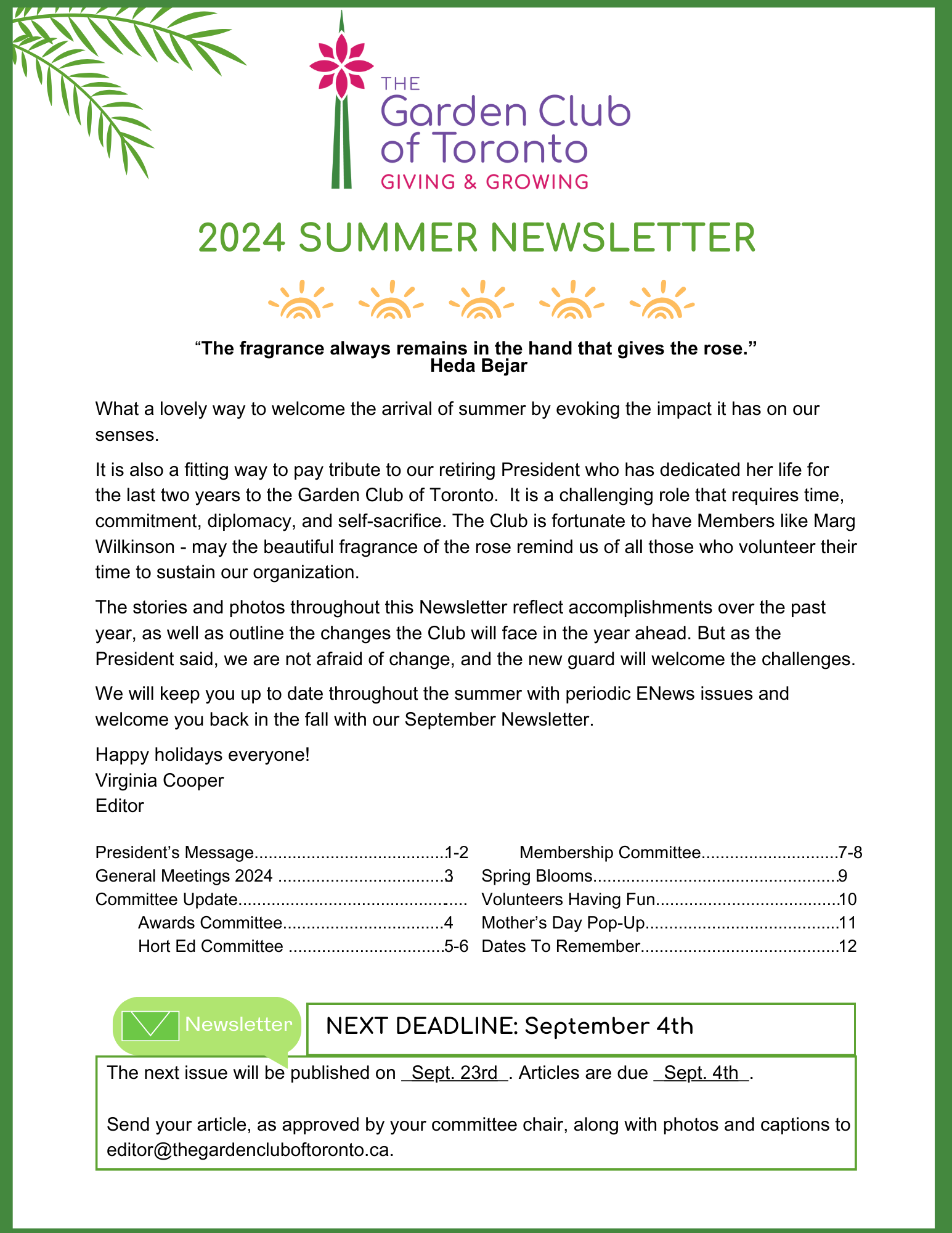 Throughout the year we produce newsletters to keep everyone informed about Garden Club activities and plans. The issues contain updates from the committees and the board meetings, the latest details on upcoming courses and events and the results of our monthly flower shows. We also include columns from our president along with photos commemorating past events and Club members.